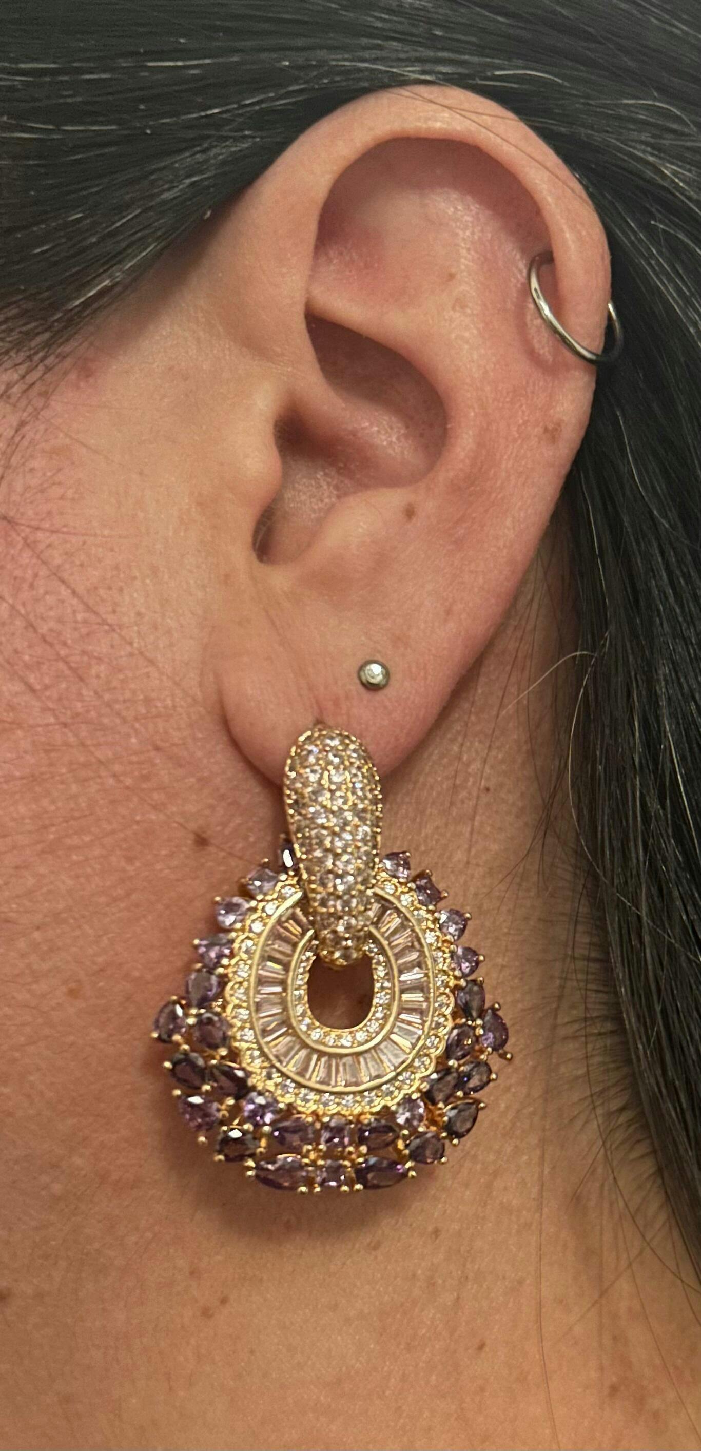 Crafted in 18k gold-plated brass and set with a striking mix of purple and pink baguette, pave, and brilliant-cut stones, this earring doesn’t just sparkle — it speaks.